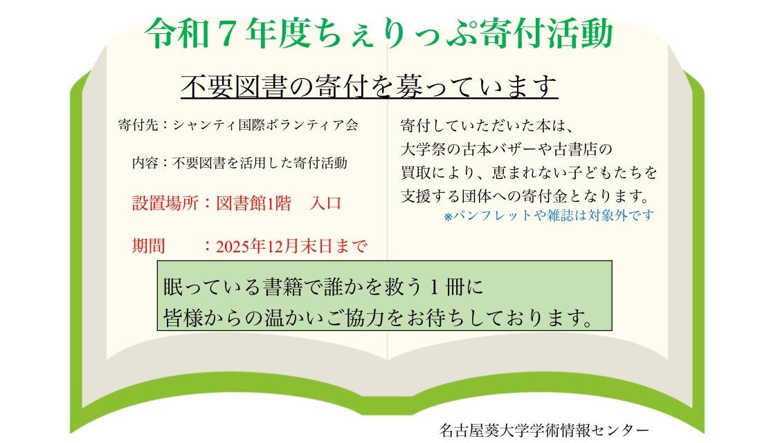 図書館サポーターちぇりっぷでは、読み終わり不要となった本の寄付を募集しています。